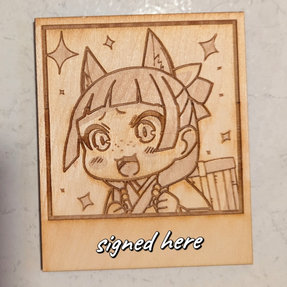 Maomao wooden polaroid shaped coaster signed by her English voice actor Emi Lo.
